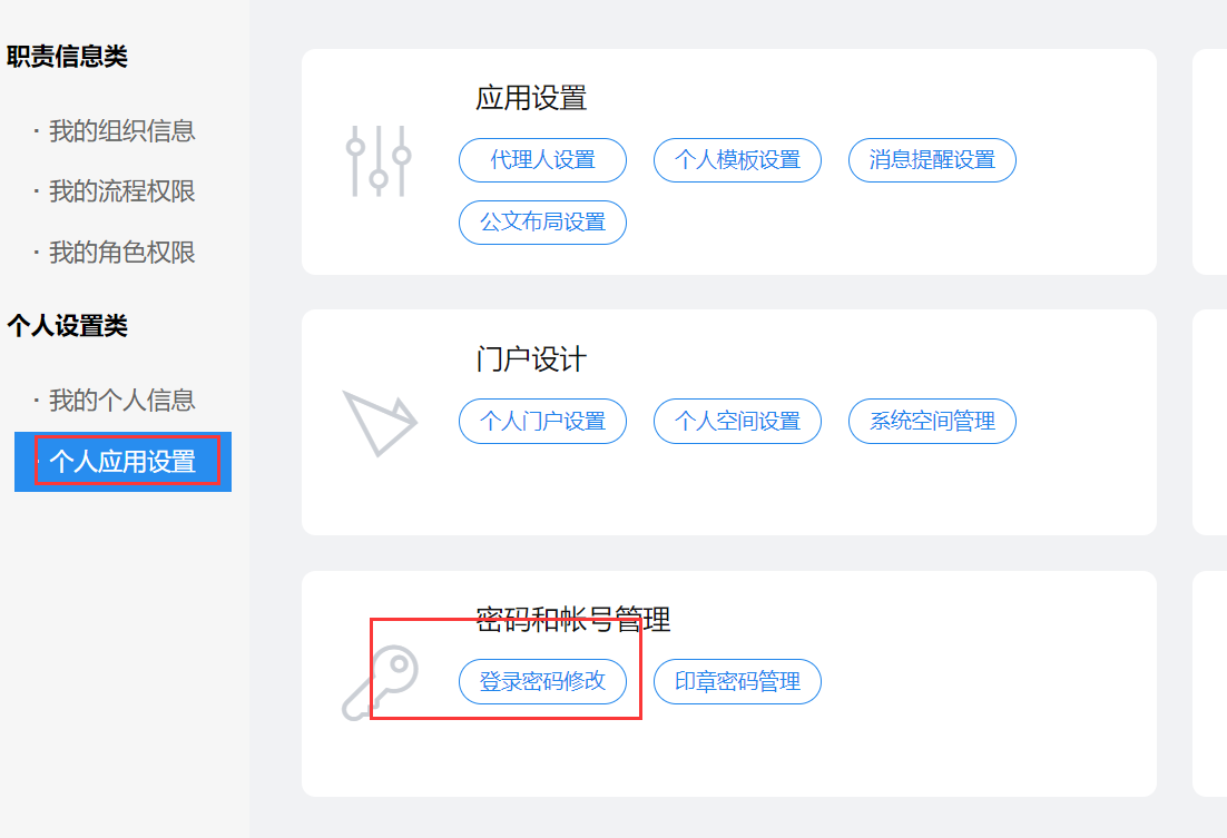 2.在个人设置中,找到密码和账号管理,登录密码修改,即可修改OA办公平台密码;