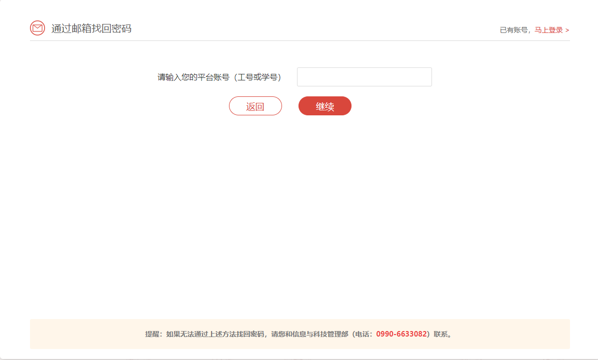 2.统一身份认证平台提供邮箱找回密码,输入“平台账号”;