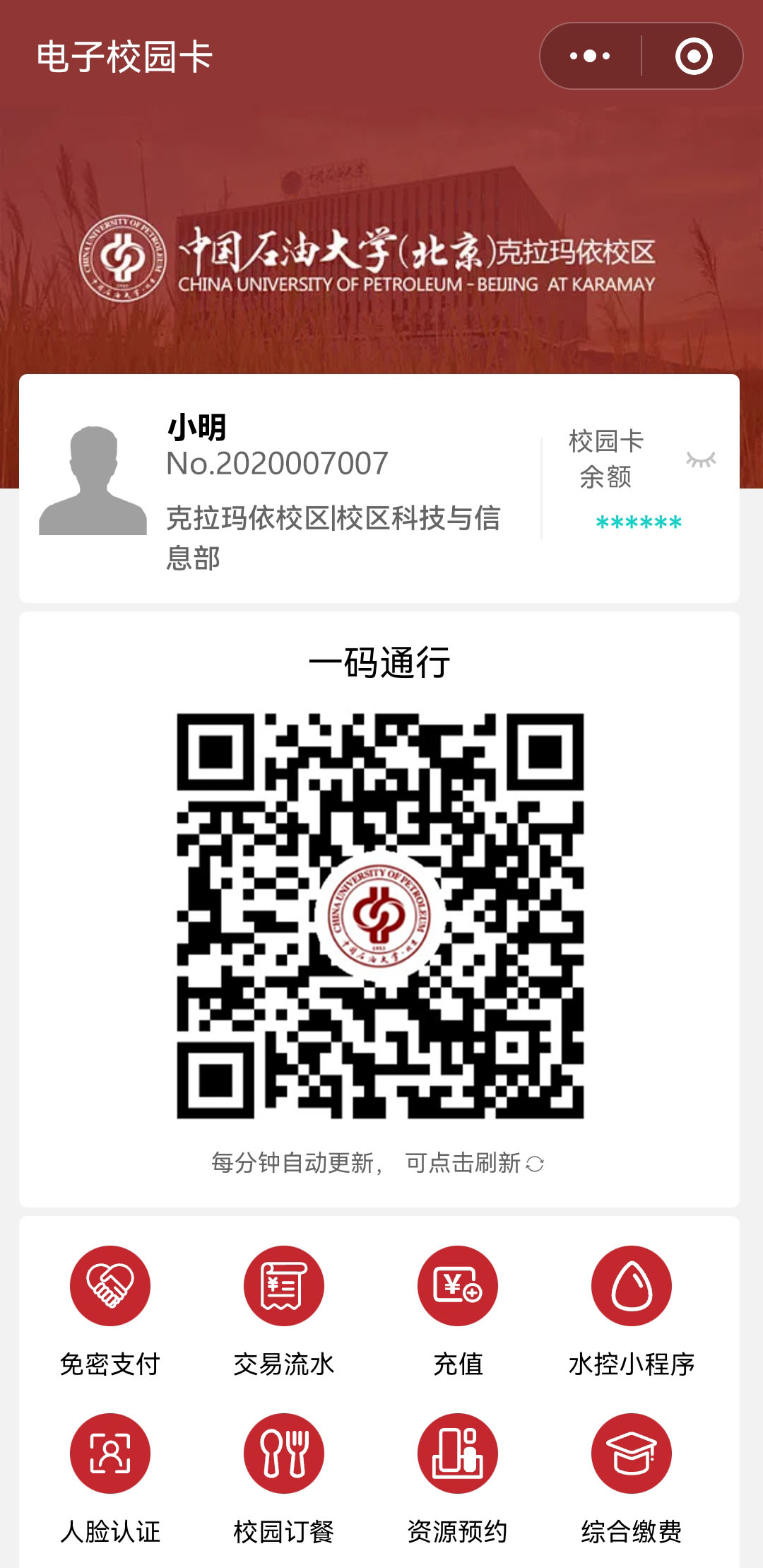 输入身份证号和姓名后,完成绑定,即可进入电子校园卡,使用各项功能。