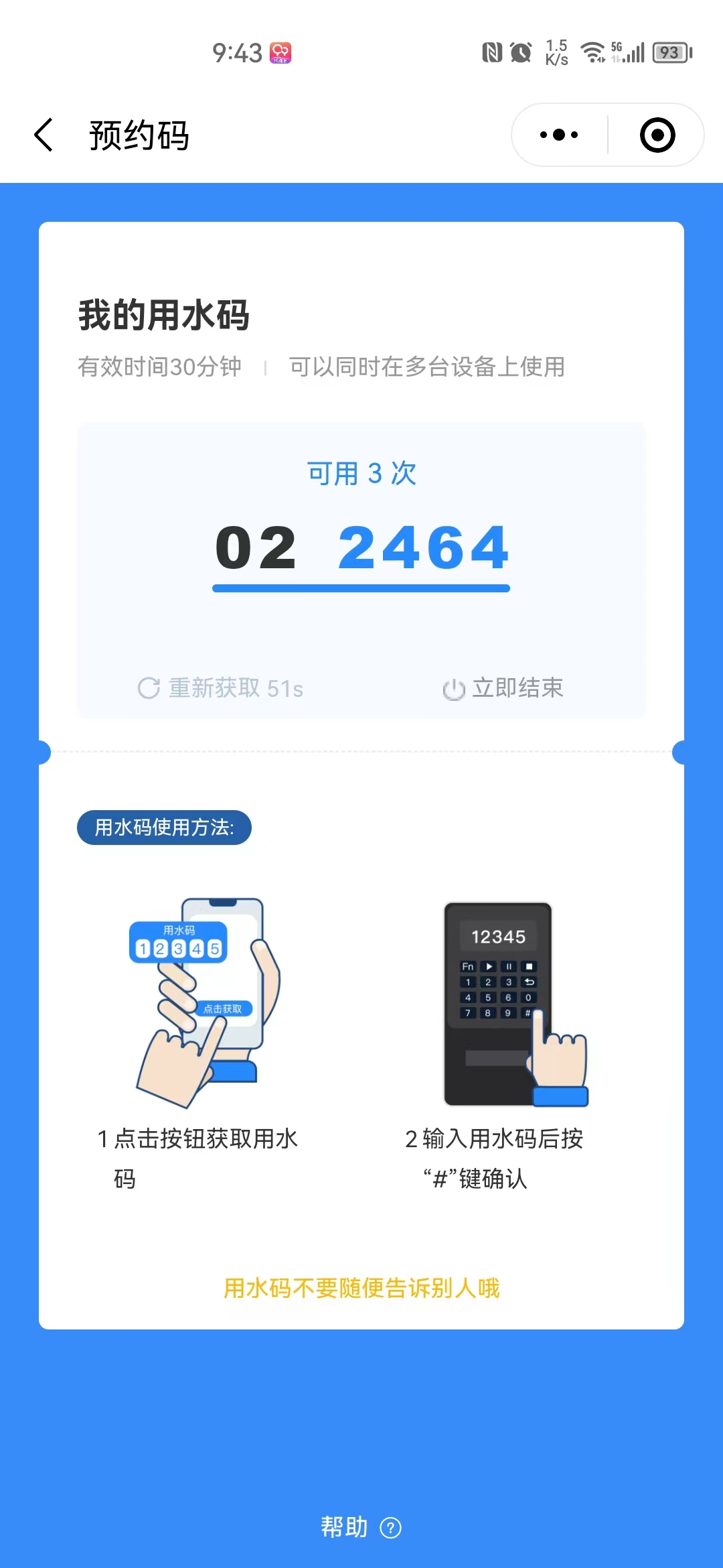 打开后即可看到6位取水码,在水控机上输入,并按下开始键用水。