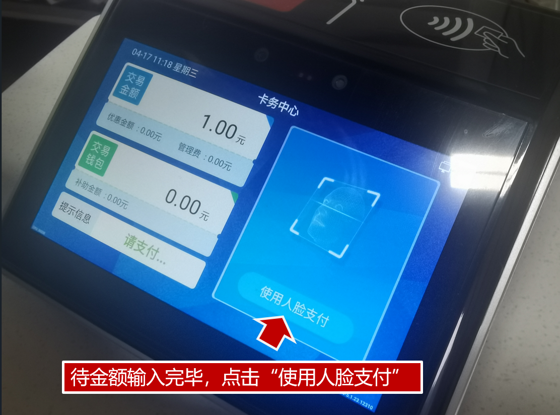 消费时,在商家输入完金额后,在消费机屏幕上点击“使用人脸支付”即可。
