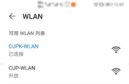 步骤 1:打开手机,“设置”→“WLAN”中,选择可用的CUP-WLAN或CUPK-WLAN,如下图: