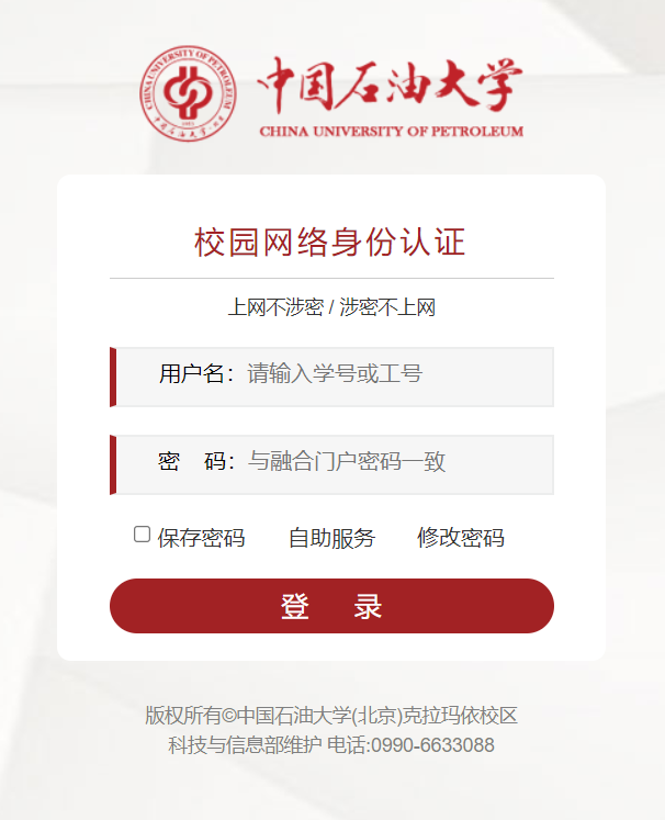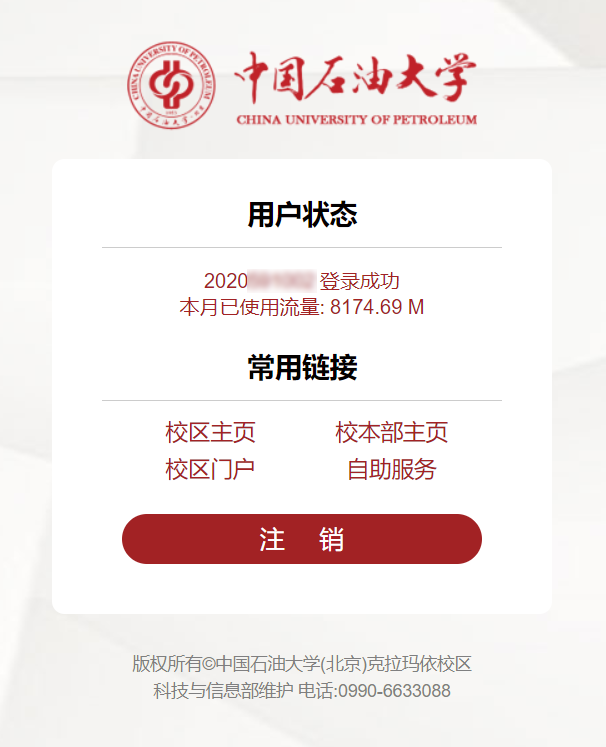 打开浏览器后,会自动弹出认证页面,也可手动访问认证页面:http://xyw.cupk.edu.cn或10.0.1.1进行认证。登录成功后会显示已使用流量情况,并可快速进入校本部官网、克拉玛依校区官网、校区门户和自助服务。