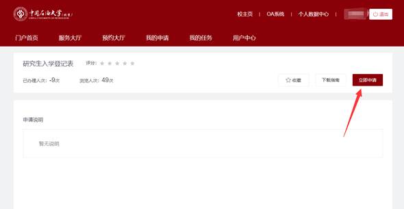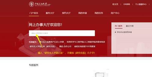 1.学生本人登录学校e服务系统(校本部网站首页最下方-快速通道-e服务,或直接点击https://eserv.cup.edu.cn/),搜索“研究生入学登记表”,点击进入,认真核对《研究生入学登记表》内所有相关信息并补充完善,确认无误后点击提交学院审核。
