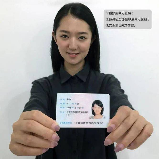 (1)拍摄时,必须将本人手持身份证的手臂和上半身整个拍进照片,头部和肩部要端正,头发不得遮挡脸部或造成阴影,要露出五官;确保身份证上的所有信息清晰可见、完整(没有被遮挡或者被手指捏住)。