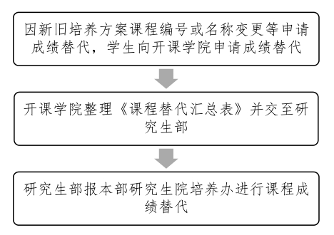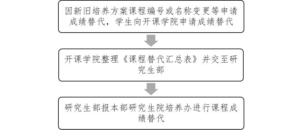 1. 校区研究生因新旧培养方案课程编号或名称变更(但学分一致)申请成绩替代,学生直接向开课学院申请,开课学院整理《课程替代汇总表》(附件1)后提交至研究生部统一报研究生院办理。