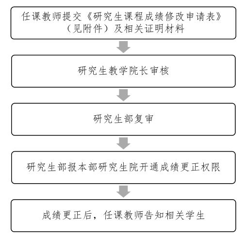 注:无特殊原因系统提交后的成绩不得更改。因试卷评阅、计分或成绩录入等过程中的疏忽,造成已录入研究生教育管理系统的成绩有误的,须按上述流程申请成绩更正。
