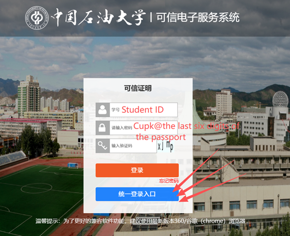 Click【统一登录入口】to log in Kexin Website https://transcript.cup.edu.cn/.