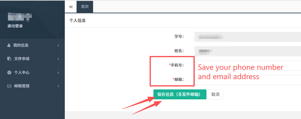 3. 填写个人手机号和邮箱,点击保存信息“非发件邮箱”。