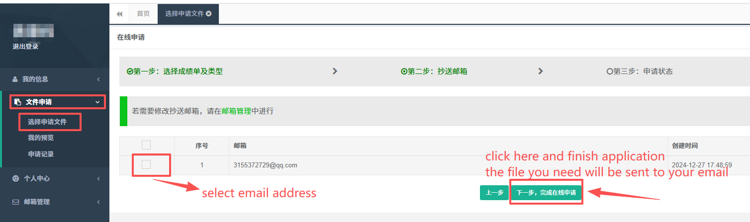 6. 选择邮箱,点击“下一步,完成在线申请”。你申请的文件将会发送到你选择的邮箱中。