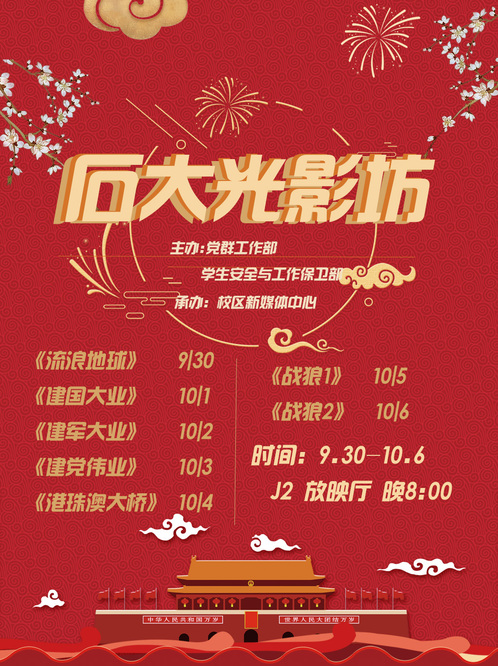 “今晚J2楼报告厅在放《建国大业》,我们一起去看吧!”在校区第一食堂入口处张贴着的海报吸引了过往同学们的目光,石油学院数据科学与大数据技术专业2018级的同学张若洋打算约上舍友一起去看电影。