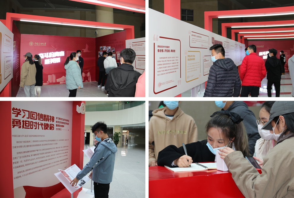 主题展览设有中心展区和主题展区两部分。中心展区回顾了党的十八大以来习近平总书记对青年的寄语,主题展区重点展现了全校师生学习贯彻重要回信精神的热忱和勇担时代使命的责任担当。展览现场,新生们不时驻足,边听边看。展览结束后,新生们纷纷在留言本上留言,感叹一代又一代的中石大人与时代同步伐、与人民共命运,以实际行动践行着“我为祖国献石油”的铮铮誓言,在祖国最需要的地方实现人生价值,为自己树立了奋斗的榜样。